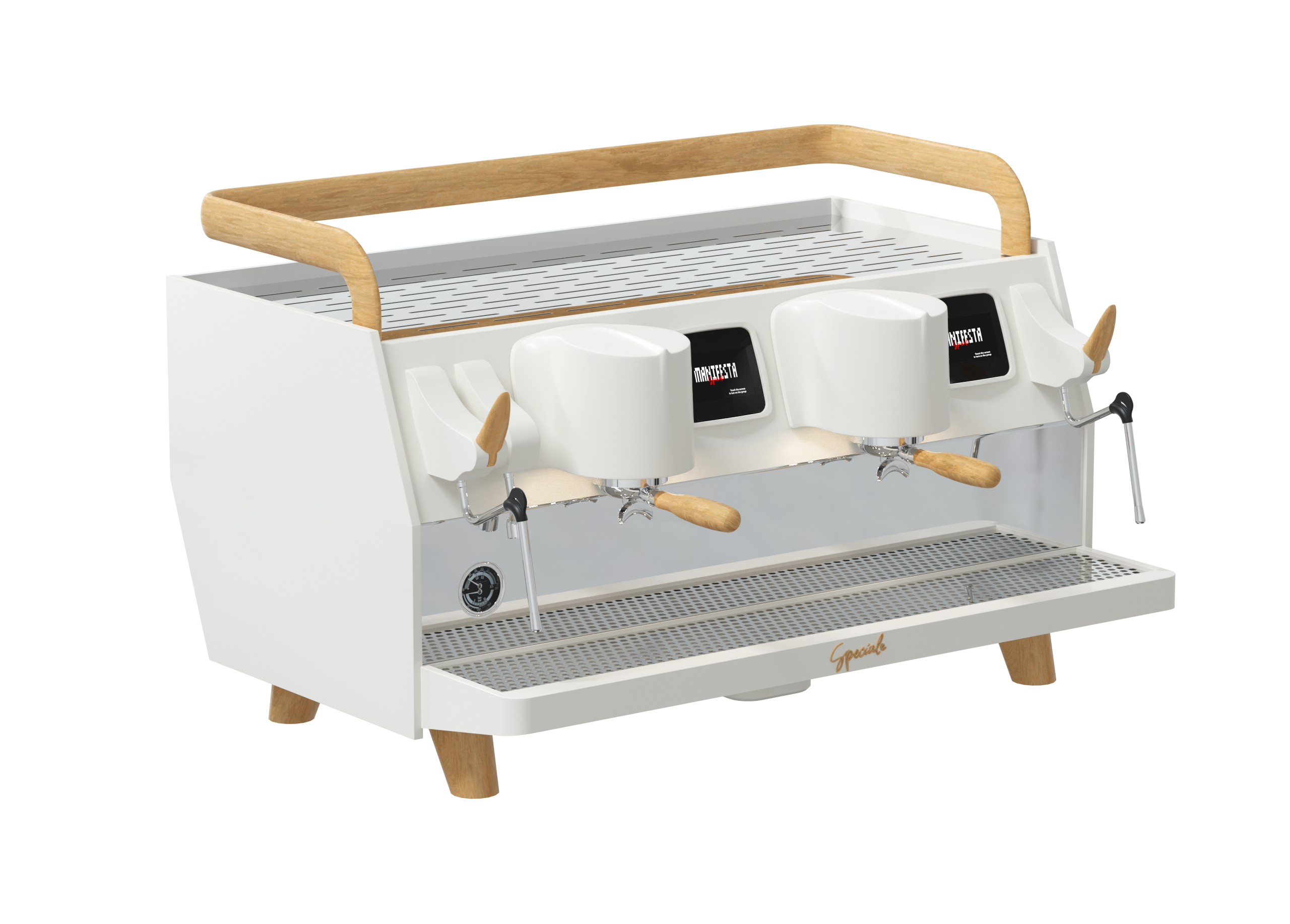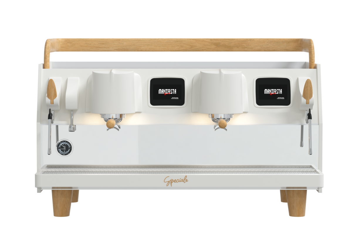 • Управление функциями Manifesta Speciale осуществляется с помощью цветного сенсорного дисплея с диагональю 4,3 дюйма для каждой рабочей группы. Бариста может программировать температуру, время экстракции, включать и отключать систему предварительного смачивания, просматривать статистику, программировать время автоматического включения и отключения кофемашины.