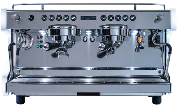 Модель оснащена Digital-дисплеем, джойстиками включения пара и регулируемым по высоте поддоном для чашек. Корпус выполнен из пищевой нержавеющей стали.