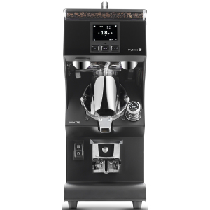 Кофемолка-автомат Victoria Arduino MY 75 (black) new version с дисплеем TOUCHSCREEN, со съёмным поддоном для отходов, имеет обновленный съемный прозрачный пластиковый загрузочный бункер в верхней части, улучшающий скольжение кофейных зерен в емкость для помола, электронный дозатор с мгновенным помолом, микрометрическую настройку помола, отображение и регулировка на экране дистанции между жерновами.