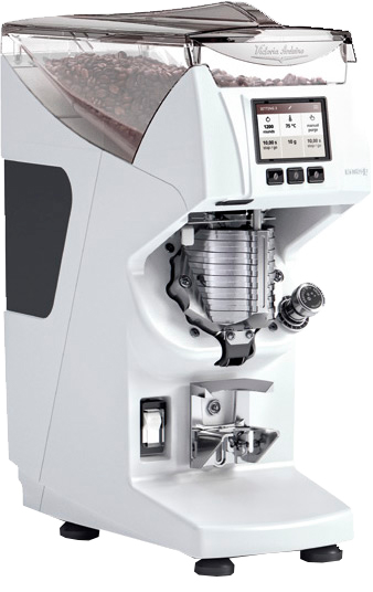 Кофемолка Victoria Arduino Mythos 2 with variable speed, white, 220V используется для приготовления молотого кофе из зерен предприятиях общественного питания, в офисах и частных домах. Микрометрическая регулировка степени помола. Корпус выполнен из алюминия, жернова - из титана, бункер - из пластика.