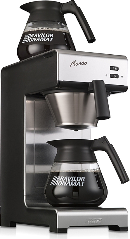 Кофеварка Bravilor Bonamat Mondo 2 New используется на предприятиях общественного питания и торговли для приготовления фильтрованного кофе. Модель оснащена системой кофеварения, 2 саморегулируемыми плитами нагрева дна, которые поддерживают оптимальную температуру кофе, индикаторами готовности кофе и удаления накипи. Корпус выполнен из высококачественной нержавеющей стали, черные детали - из синтетических материалов.