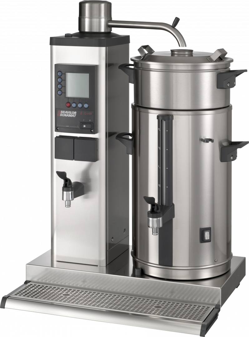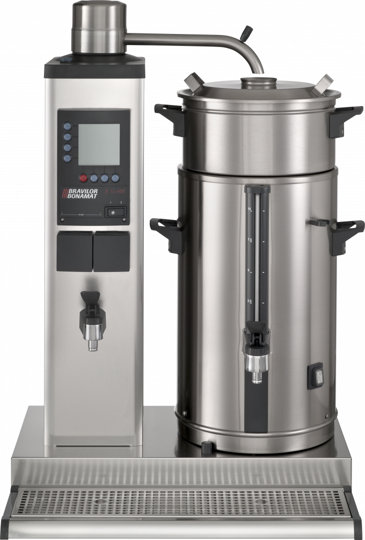 Кофеварка капельная с проточным водонагревателем BRAVILOR BONAMAT B10 HW L (b/b) используется на предприятиях общественного питания и торговли для приготовления фильтрованного кофе и горячей воды, предназначенной для супа, каши, чая и других горячих напитков. Модель оснащена цифровым дисплеем, системой кофеварения, 2 емкостями для кофе с подогревом, отдельным краном горячей воды, индикаторами заполнения, готовности кофе и удаления накипи и поддоном для капель. Корпус выполнен из нержавеющей стали.