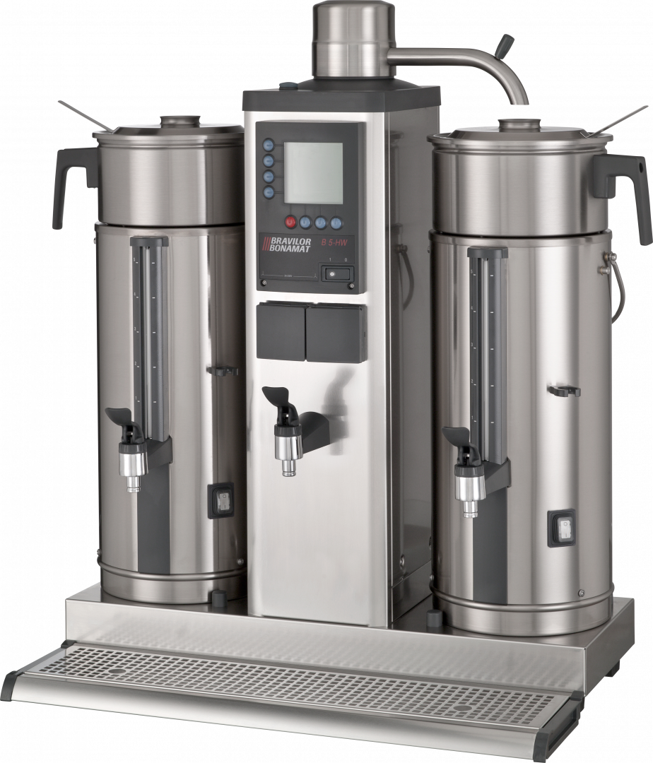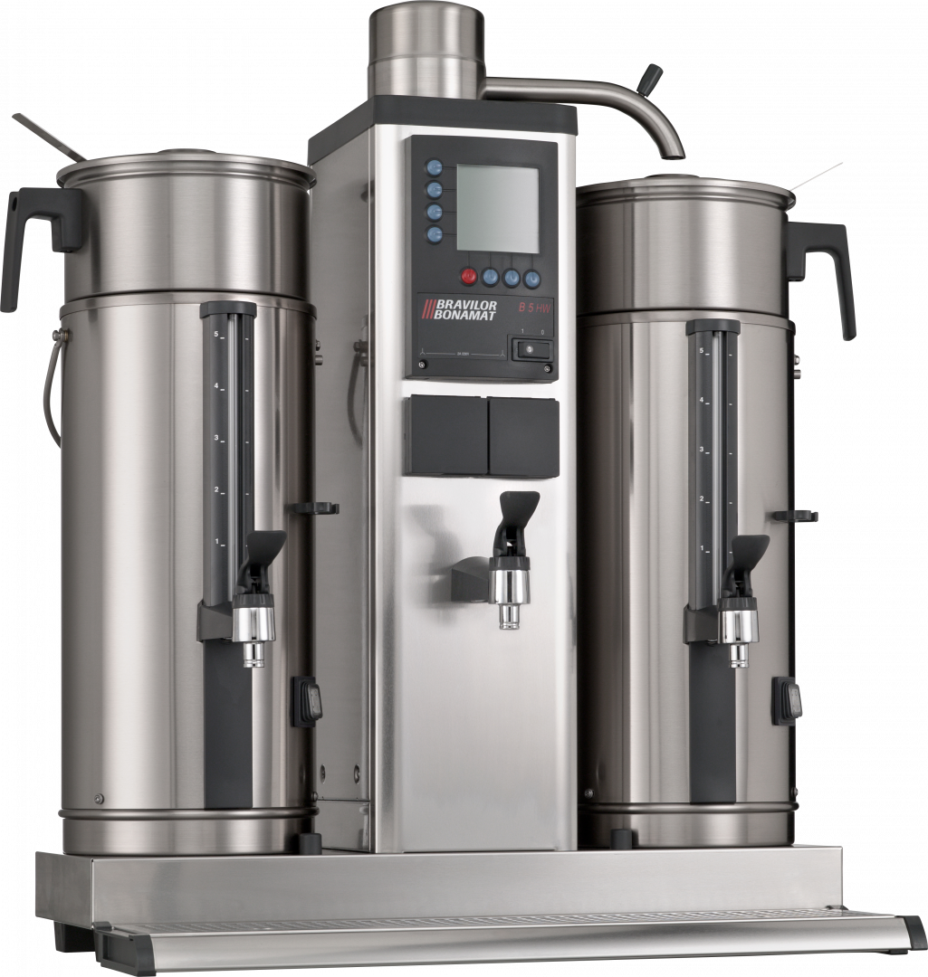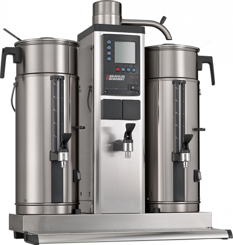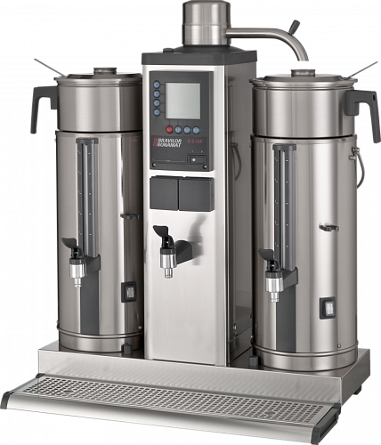 Кофеварка капельная с проточным водонагревателем BRAVILOR BONAMAT B5 HW (b/b) используется на предприятиях общественного питания и торговли для приготовления фильтрованного кофе и горячей воды, предназначенной для супа, каши, чая и других горячих напитков. Модель оснащена цифровым дисплеем, системой кофеварения, 2 емкостями для кофе с подогревом, 2 заварными чашами, отдельным краном горячей воды, индикаторами заполнения, готовности кофе и удаления накипи и поддоном для капель. Корпус выполнен из нержавеющей стали. В комплект поставки входит фильтр из нержавеющей стали.