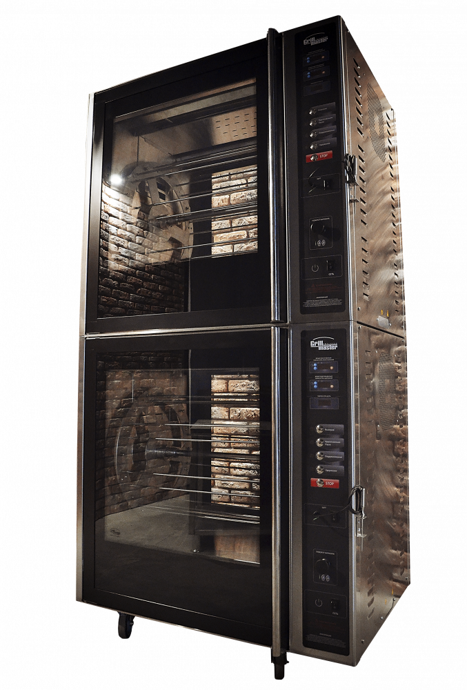 Установленные в единую колонну гриль-гриль. Гриль нового поколения, 6+6 спиц для одновременного приготовления 48 тушек (до 2 кг), опционально 6+6 корзин для кур и субпродуктов, или 6+6 угловых шампуров для кур (опция), возможно одновременное использование корзин и спиц для приготовления, мощные вентиляторы конвекции, яркая галогенная подсветка камер(600+600 Вт), ИК лампы для безупречной корочки, 3 режима приготовления, термощуп, электронная панель управления с джойстиком и программированием, сквозной доступ в камеру грилей (2 двери), стекла грилей с теплоотражающим покрытием, полностью из н/стали, может быть выкрашен в цвет на выбор клиента, 50-250 С, установлены в единую колонну, нижний гриль на колесах со стопорами 8 кВт+8 кВт, единое подключение 380В, г.нетто 830х780х1790мм, г.брутто 420кг
