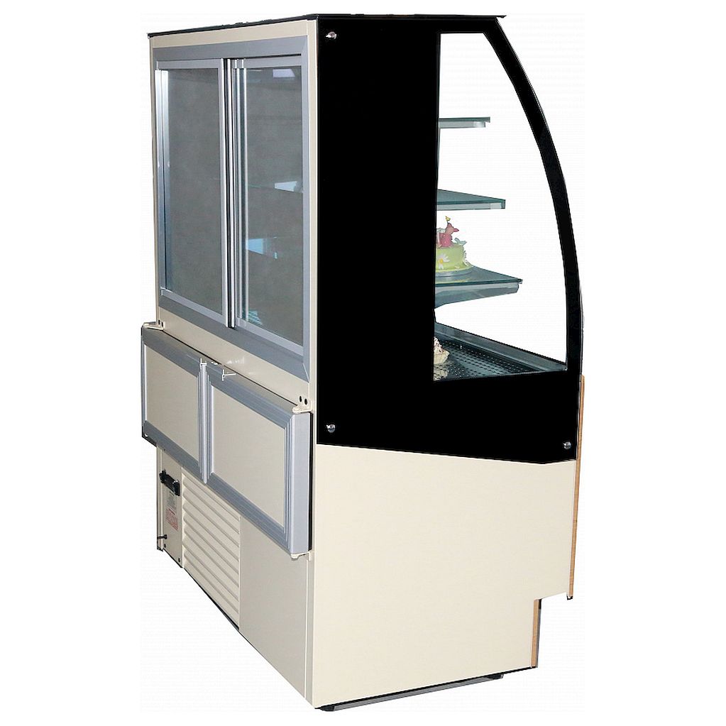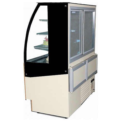 Данная модель позволяет максимально эффективно использовать пространство благодаря большой площади выкладки. Обзор товара, помещенного в данную витрину - 90% благодаря отсутствию соединительных профилей стекла, а боковые стенки и задние шторки прозрачные. Внутренний объем охлаждается равномерно, но при этом кондитерские изделия, помещенные в витрину не заветриваются, даже без упаковки.