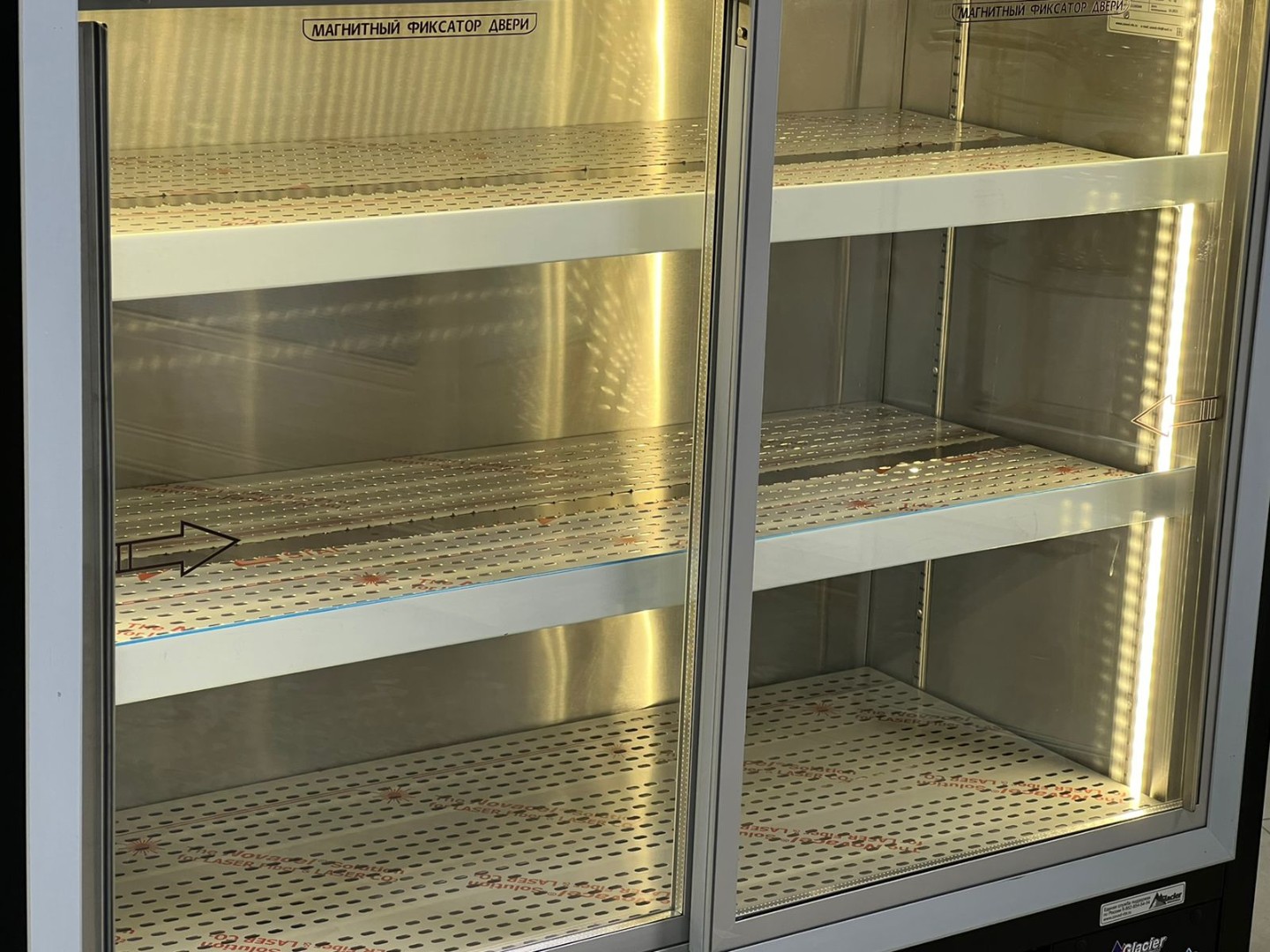 Холодильная витрина, одна стенка которой термо-азотированный стклопакет в алюминиевом профиле с подогревом, а противоположная сторона- двери-купе со стеклопакетами в алюминиевых профилях с подогревом.