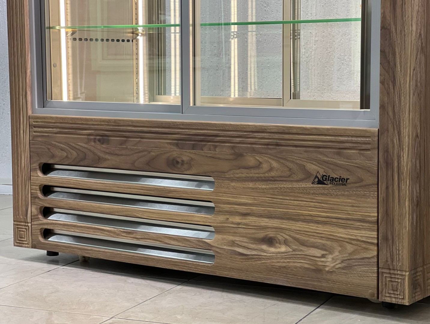 Холодильная витрина, одна стенка которой термо-азотированный стклопакет в алюминиевом профиле с подогревом, а противоположная сторона- двери-купе со стеклопакетами в алюминиевых профилях с подогревом.