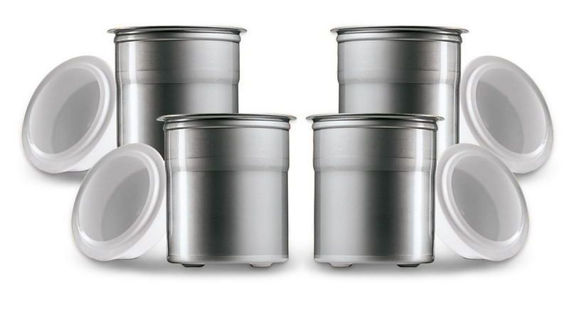 Контейнер для аппарата PACOJET набор 4шт применяется для совместного использования с гомогенизаторами. Стаканы выполнены из нержавеющей стали, крышки - из пластика белого цвета.