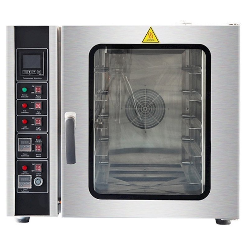 Наличие естественной и принудительной конвекции обеспечивает равномерное распределение тепла по камере, создавая на поверхности изделий ровную, румяную корочку. Встроенная система пароувлажнения позволяет придать изделиям глянцевый блеск, улучшает подъем и предотвращает растрескивание.