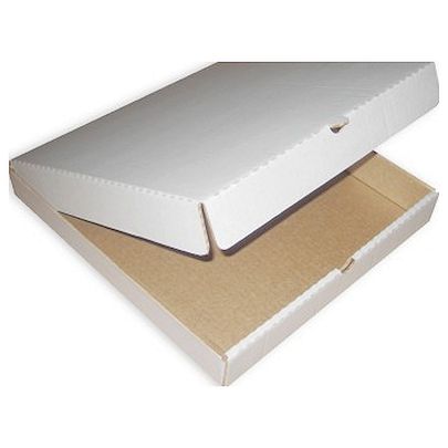 Картонная коробка для упаковки пиццы, с откидной крышкой. Внешний цвет белый, внутренний - бурый.