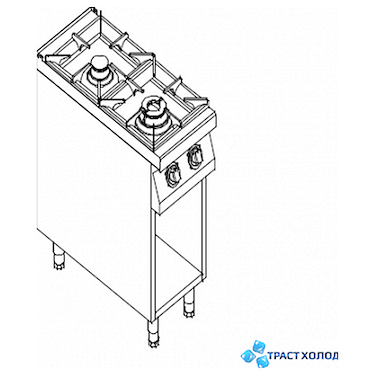 Корпус выполнен из нержавеющей стали, поставляется на открытой подставке. Плита оснащена двумя газовыми горелками, выполненными из серого чугуна, мощностью 3,5 кВт и 7 кВт.
