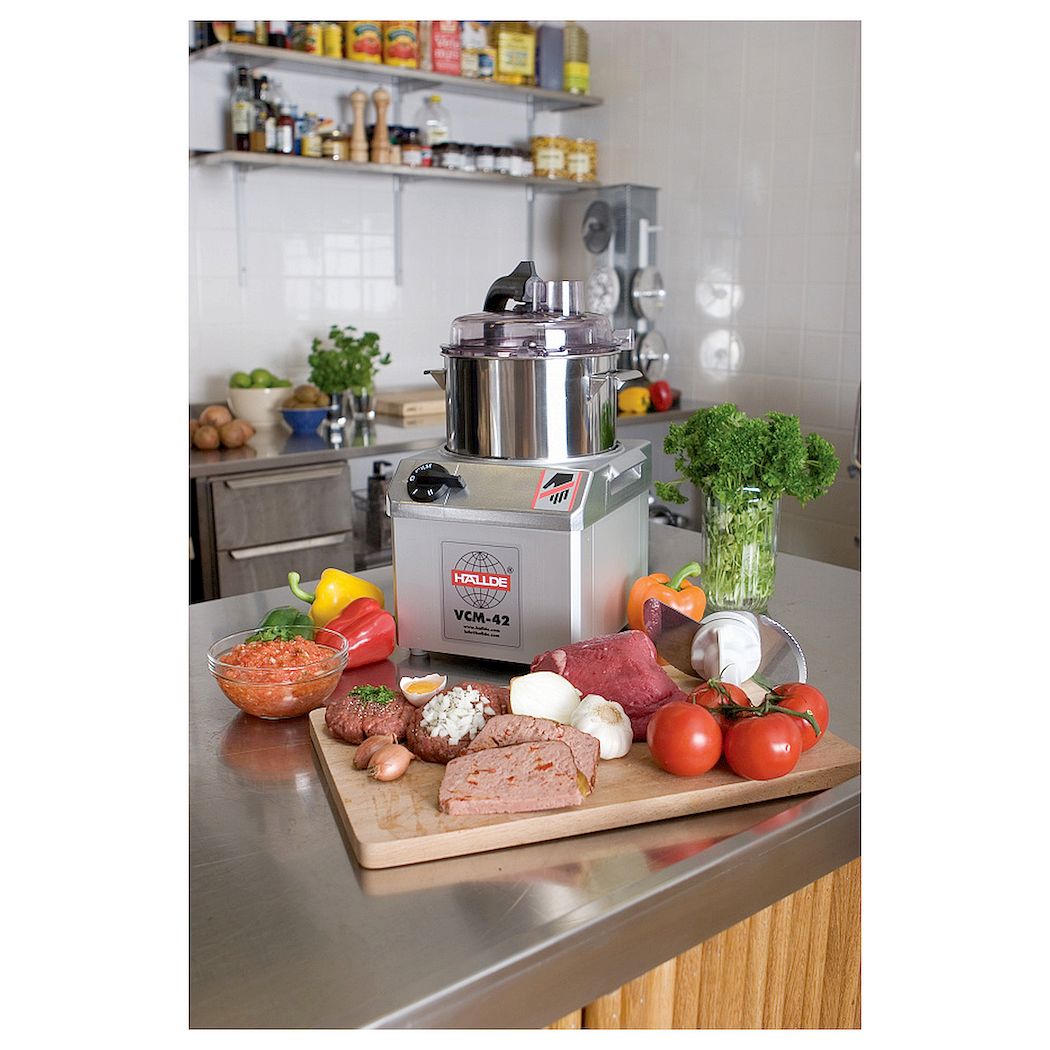 Куттер Hallde VCM-42 используется на предприятиях торговли и общественного питания для переработки пищевых продуктов: измельчение, мелкая нарезка и перемешивание практического любого типа продукта - от овощей до орехов, приготовление ароматизированных масел, десертов, фарша, пюре, паштетов и панировочных сухарей.