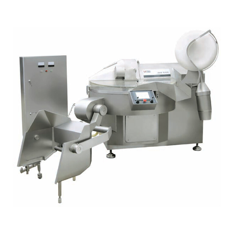Объем рабочей чаши в данной модели составляет 200 л, разовая загрузка продуктов – до 125 кг. Скорость вращения ножей – трехступенчатая, максимальная – 3000 об/мин. Переключение скорости вращения чаши – двухступенчатое (8/12 об/мин.) Аппарат оснащен индикатором скоростей, имеется система контроля температуры сырья.