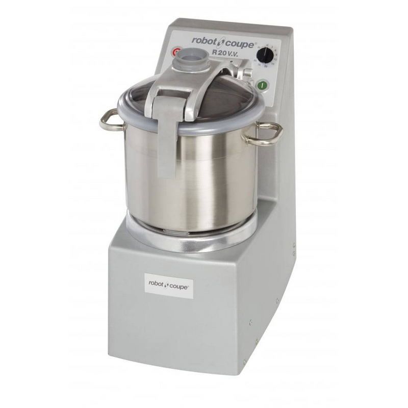 Куттер ROBOT COUPE R20 VV с чашей из нержавеющей стали объемом 20 л. Прозрачная крышка с отверстием для добавления жидких продуктов во время работы. Чаша с ручкой, ручка на задней части аппарата. Нож из нержавеющей стали на дне чаши с новым профилем лезвий. Регулируемая скорость от 300-3500 об/мин. Кнопка импульсного режима. Производительность до 12 кг за загрузку. Размер 380х630х700 мм. Мощность 4,4 кВт. Напряжение 230 В/50-60 Гц/1