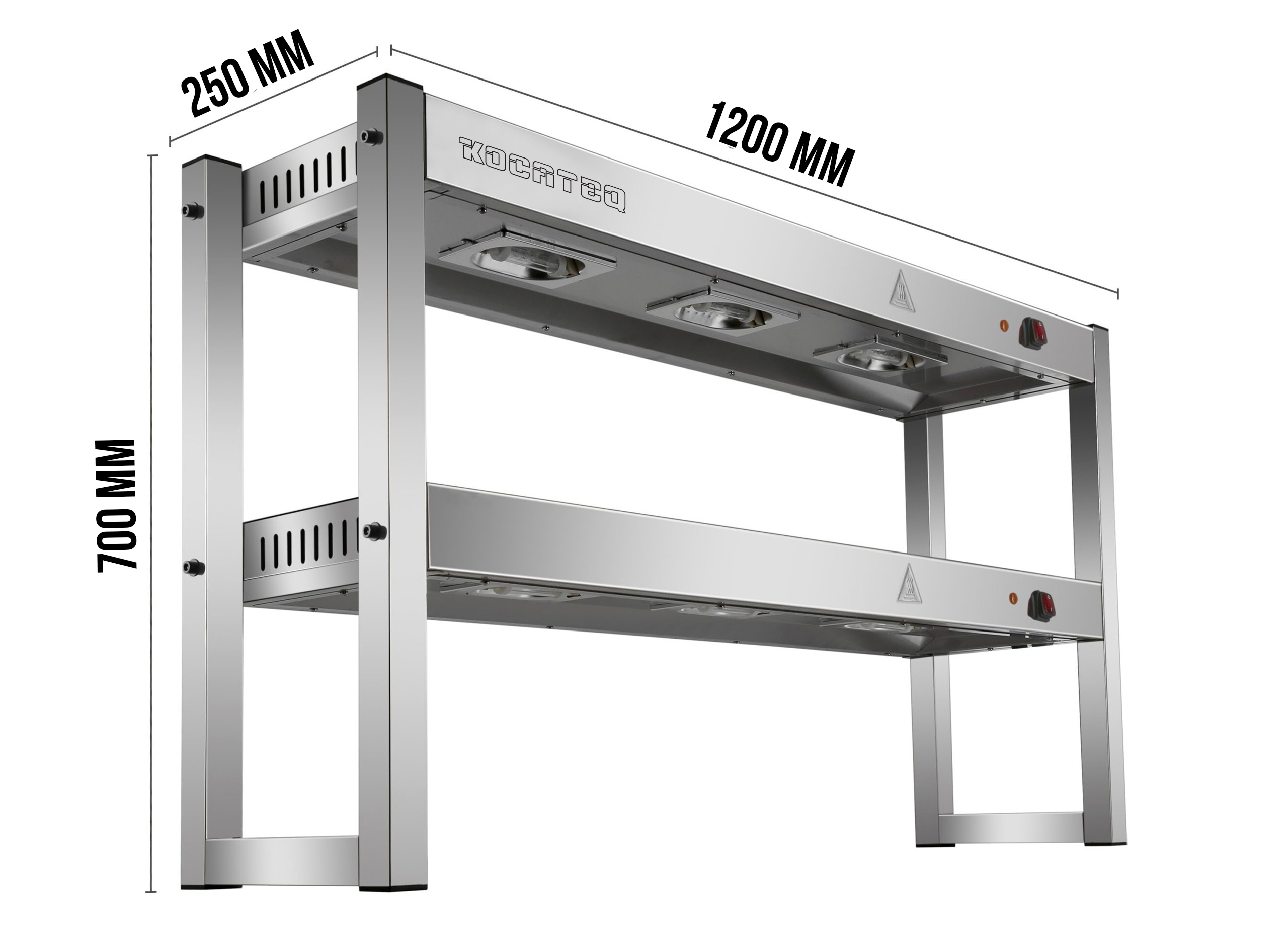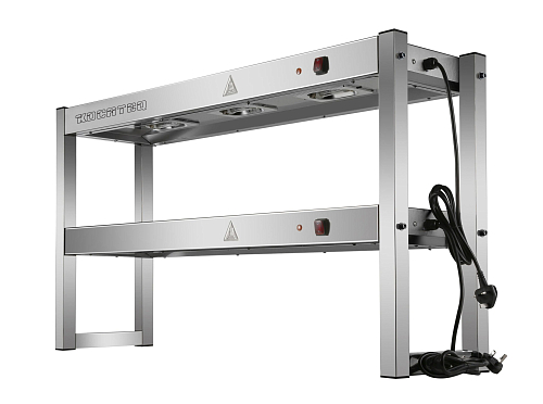 Лампа тепловая Kocateq DHWD 122 настольная, 2 уровня, ИК нагрев, ширина 120 см используется на предприятиях общественного питания и торговли для поддержания тарелок, готовых блюд и продуктов в горячем виде. Модель оснащена 2 уровнями с раздельным включением нагрева и 3 кварцевыми лампами. Корпус выполнен из нержавеющей стали AISI 201.