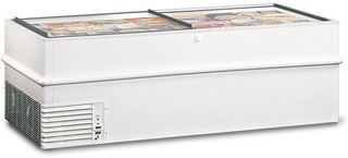 Может использоваться как морозильный ларь большого объема. Толщина изоляции 70 мм. Мощный вентилятор повышает эффективность работы испарителя. Раздвижные стеклянные крышки выполнены из термостойкого и ударопрочного стекла. 2 встроенных термометра.