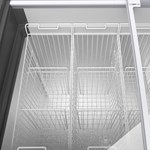 Импульсный морозильник с вертикальной загрузкой и подвесными вместительными корзинами, механическим управлением и крышкой с двумя раздвижными изогнутыми стеклами с замком на 2 ключа.