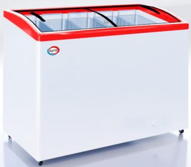 Морозильник с вертикальной загрузкой оснащен электромеханическим управлением, крышка имеет 2 раздвижных изогнутых стекла с замком, а прорезиненые поворотные колеса позволяют легко перемещать загруженный ларь.