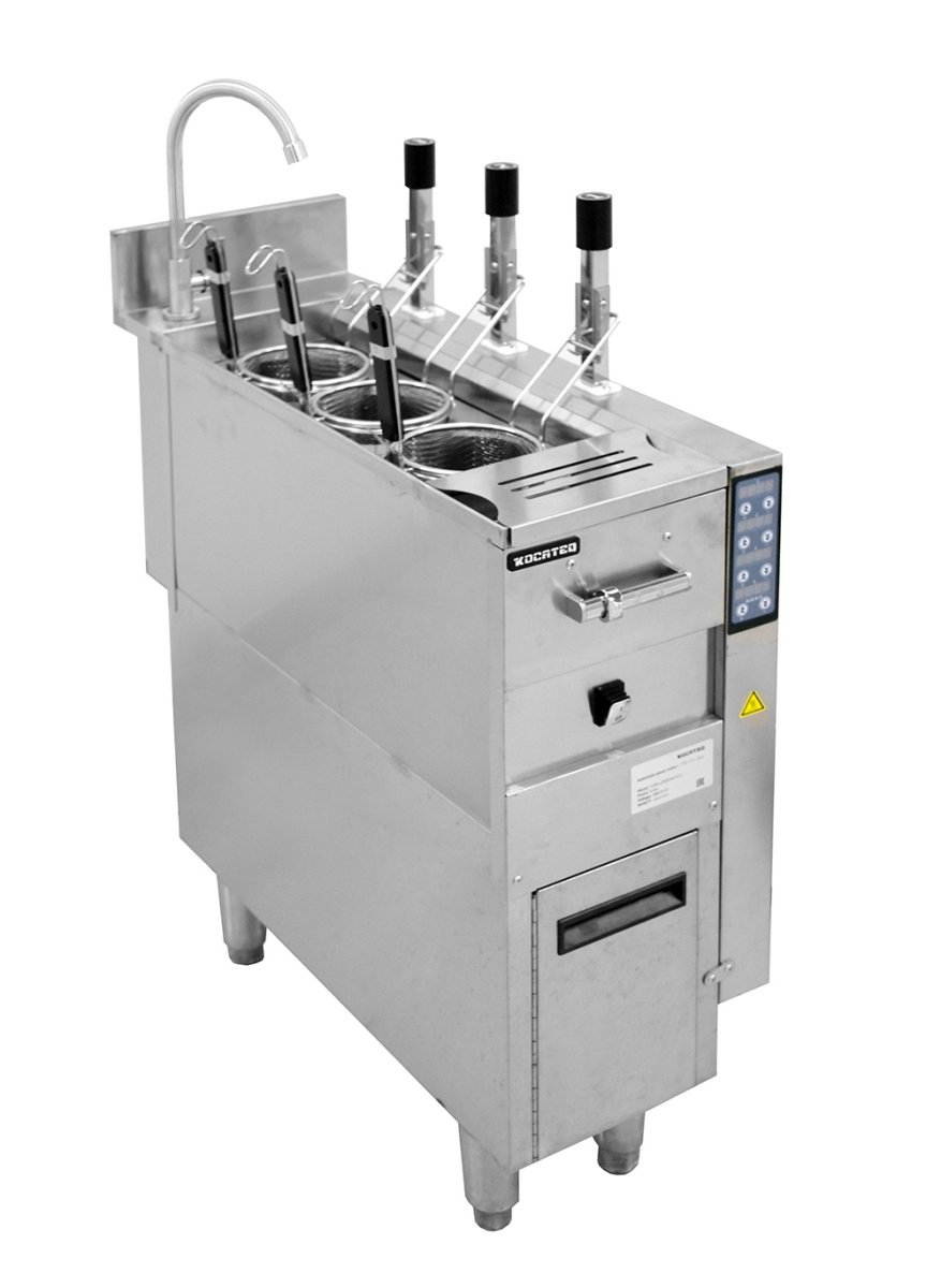 • Макароноварка (паста-бойлер) напольная с автоматическим опусканием и подниманием 3 порционных корзин диаметром 13,5 см и глубиной 15 см с термоизолированными ручками и зацепами.