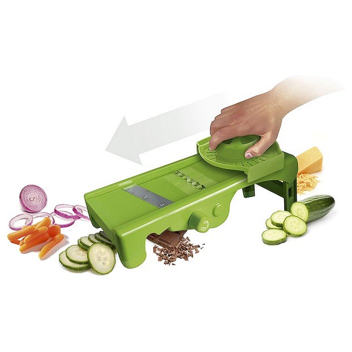 32,8*16,4*9 см. 3 лезвия в комплекте, 8 видов нарезки, толщина от 1 до 9 мм, 6/9 кусков