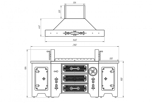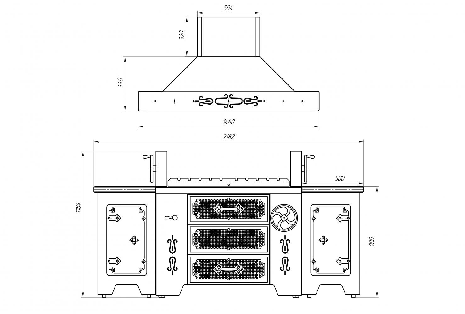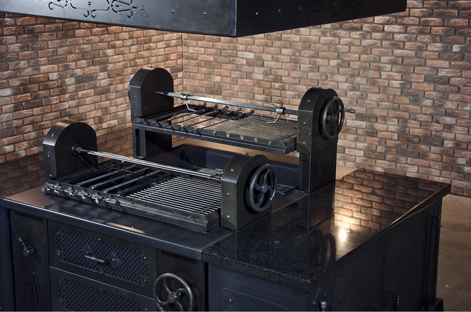 Винтажный стиль, выполнен полностью из нержавеющей стали, дополнительно низ мангала и верх вытяжки выкрашен в черный цвет и покрыт матовым лаком, 2 сетки для жарки стейков/рыбы/шашлыка 10 шампуров для шашлыка, 1 центральный шампур из нержавеющей стали для жарки барашка/попросенка/кабана/ с механическим и электрическим приводом приводом(регулировка шампура по горизонтали),1 центральный шампур из нержавеющей стали для жарки дичи с механическим и электрическим приводом(регулировка шампура по горизонтали) регулируемое поддувало, 2 выдвижных отсека для золы,2 подкатных стола со столешницами из натурального гранита с нейтральными полками, кочерга и лопата, вытяжка в винтажном стиле, масса 400 кг; комплект поставки: мангал островного типа, 1 шампур для барашка/поросенка, 1 шампур для дичи, 2 сетки из н/стали для стейков/рыбы, 10 шампуров для шашлыка, натуральный гранитный камень в качестве рабочих поверхностей, кочерга и лопата для углей, габаритные размеры мангала в комплекте 2182х1460х900, эквивалентная мощность 78 кВт.