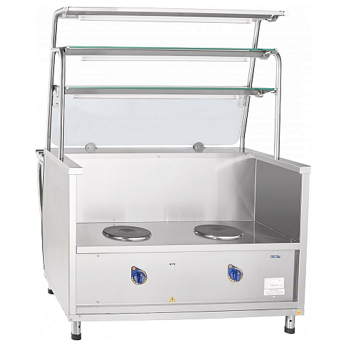 Мармит 1-х блюд Abat (Чувашторгтехника) ПМЭС-70Т используется для непродолжительного сохранения первых блюд в наплитных котлах в горячем состоянии, а также для раздачи их потребителям. Конфорки мармита имеют регулировку мощности, а каждый из трех ярусов полки над мармитом оснащен лампой подсветки. На ней можно выкладывать порционные блюда.