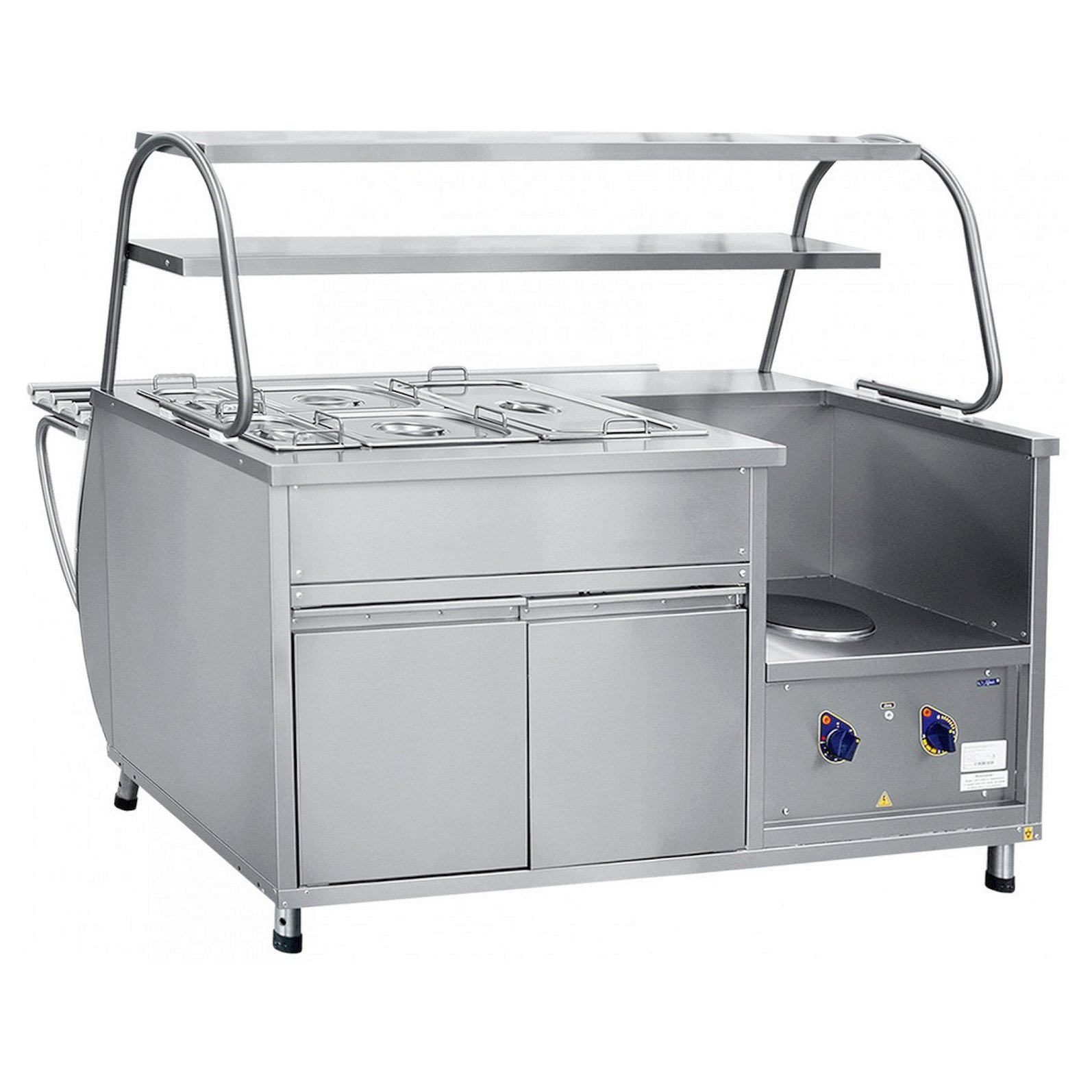 Мармит 1-х и 2-х блюд Abat (Чувашторгтехника) ЭМК-70МУ универсальный паровой предназначен для кратковременного сохранения в горячем состоянии первых блюд в наплитных котлах и вторых блюд в гастроемкостях и раздачи их потребителям. Мармит устанавливается на предприятиях общественного питания самостоятельно или в составе технологической линии раздачи пищи. Универсальный мармит имеет одну конфорку, для установки наплитных котлов с первыми блюдами, а также комплект гастроемкостей (GN 1/1 - 1 шт, GN 1/2 - 2 шт, GN 1/4 - 2 шт.) для вторых блюд. Таким образом, в одном изделии сочетаются функции двух мармитов, что позволяет существенно сэкономить на приобретении оборудования, занимаемой площади и расходах на электроэнергию. Гастроемкости устанавливаются на паровую ванну, что предотвращает высушивание пищи. ЭМК-70МУ имеет двойную полку с лампой подсветки. Все детали прилавка выполнены из высококачественной нержавеющей стали. Мармит имеет регулируемые по высоте ножки.