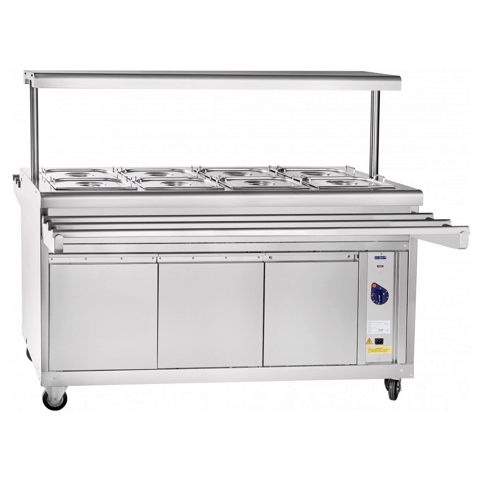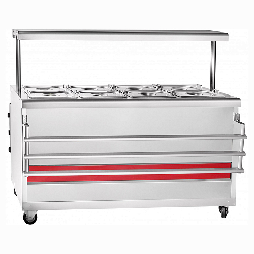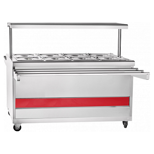 Внизу мармита расположен нейтральный шкаф, в котором Вы можете хранить кухонный инвентарь. Для выкладывания порционных блюд и напитков над мармитом расположена полка с лампой подсветки. В комплект поставки входят складывающиеся с двух сторон направляющие для подносов и набор гастроемкостей.