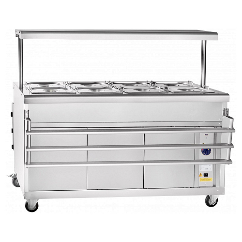 Гастроемкости обогреваются горячим паром, который поступает от двух ТЭНов, размещенных под ванной. Мармит оснащен плавной регулировкой температуры в диапазоне от 30 до 85 °С. Ванна со сливом мармита легко поддается гигиенической чистке и обслуживанию.
