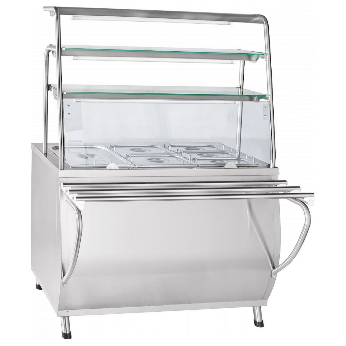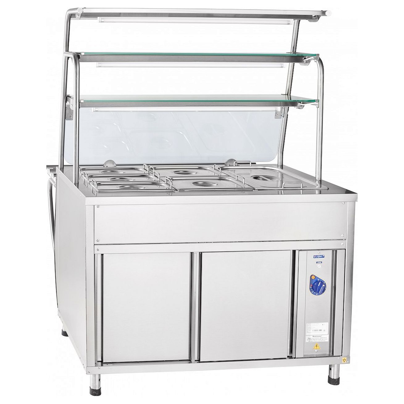 Внизу мармита расположен нейтральный шкаф с дверками-купе, в котором Вы можете хранить кухонный инвентарь. Над мармитом расположена трехъярусная полка, каждый уровень которой оснащен лампой подсветки. На ее большой полезной площади можно выкладывать порционные блюда. Перегородка из закаленного стекла отделяет гастроемкости от посетителей. Ножки мармита для удобства регулируются по высоте. В комплект поставки входят направляющие для подносов и гастроемкости.