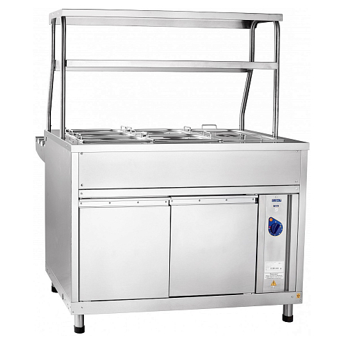 Внизу мармита расположен нейтральный шкаф, в котором Вы можете хранить кухонный инвентарь. Над мармитом расположена двойная полка с лампой подсветки. На ее большой полезной площади можно выкладывать порционные блюда. Ножки мармита для удобства регулируются по высоте. В комплект поставки входят направляющие для подносов и гастроемкости.