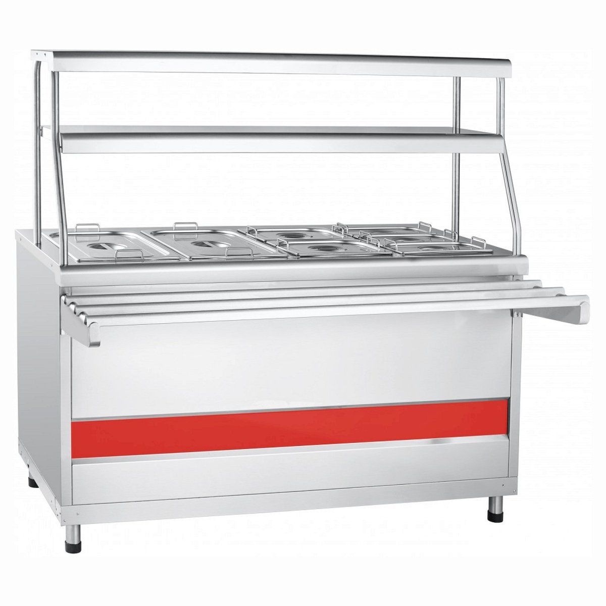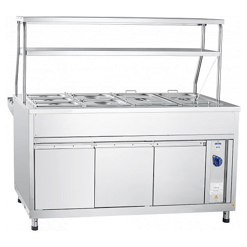 Внизу мармита расположен нейтральный шкаф, в котором Вы можете хранить кухонный инвентарь. Над мармитом расположена двойная полка с лампой подсветки. На ее большой полезной площади можно выкладывать порционные блюда. Ножки мармита для удобства регулируются по высоте. В комплект поставки входят направляющие для подносов и гастроемкости.