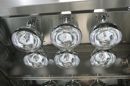 Нагрев продуктов осуществляется с помощью 4 ИК-ламп мощностью 375 Вт каждая, расположенных в верхней части витрины. Все элементы, соприкасающиеся с продуктами, изготовлены из нержавеющей стали AISI 304.