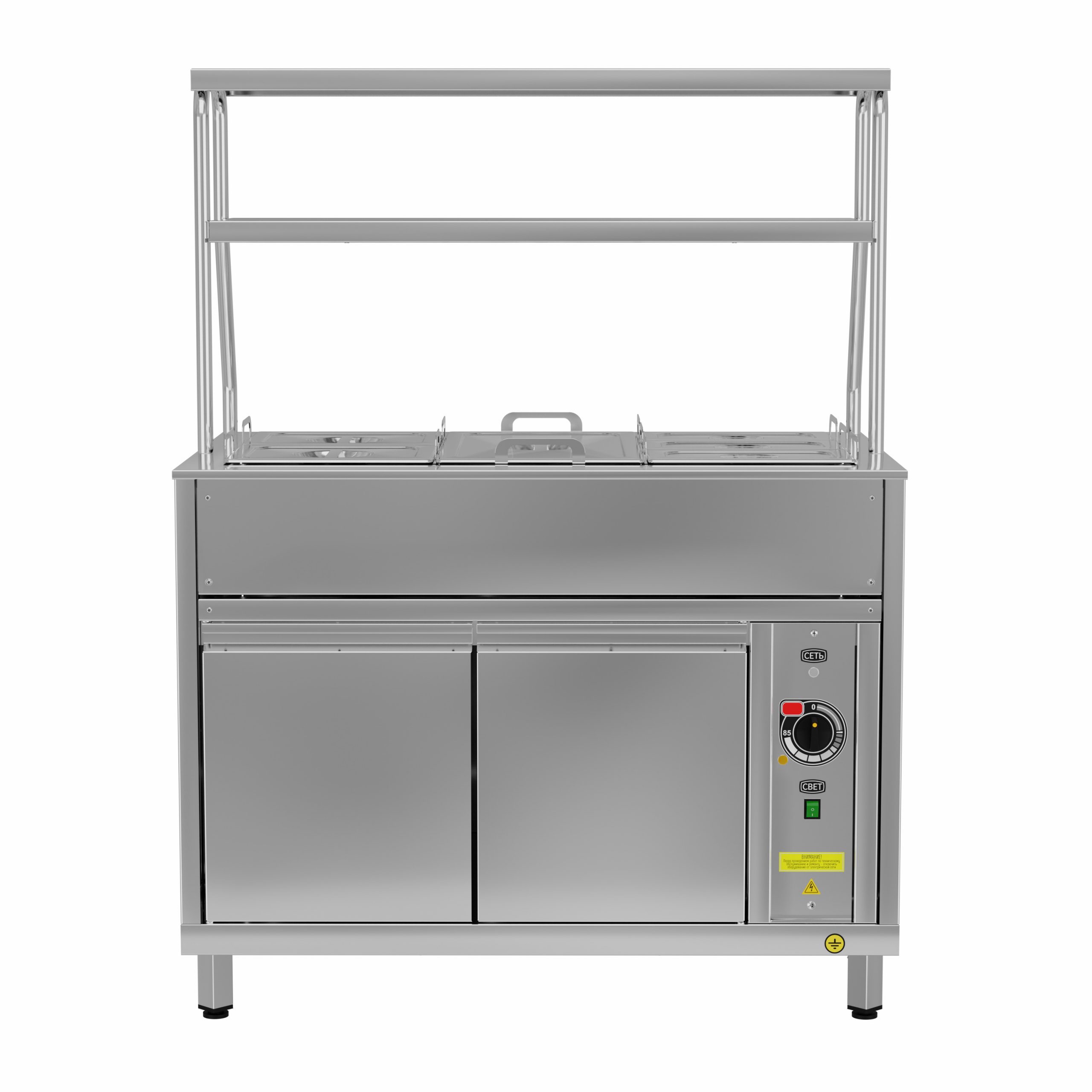 Мармит электрический для вторых блюд Gabino MM2V-10/7 паровоого типа, на закрытом стенде с 2 глухими распашными дверцами, 2 верхними сплошными полками с подсветкой 2 светильниками предназначен для оперативного хранения, демонстрации и раздачи в горячем виде вторых блюд в гастроёмкостях.