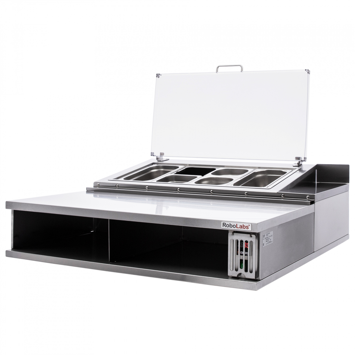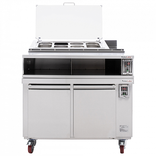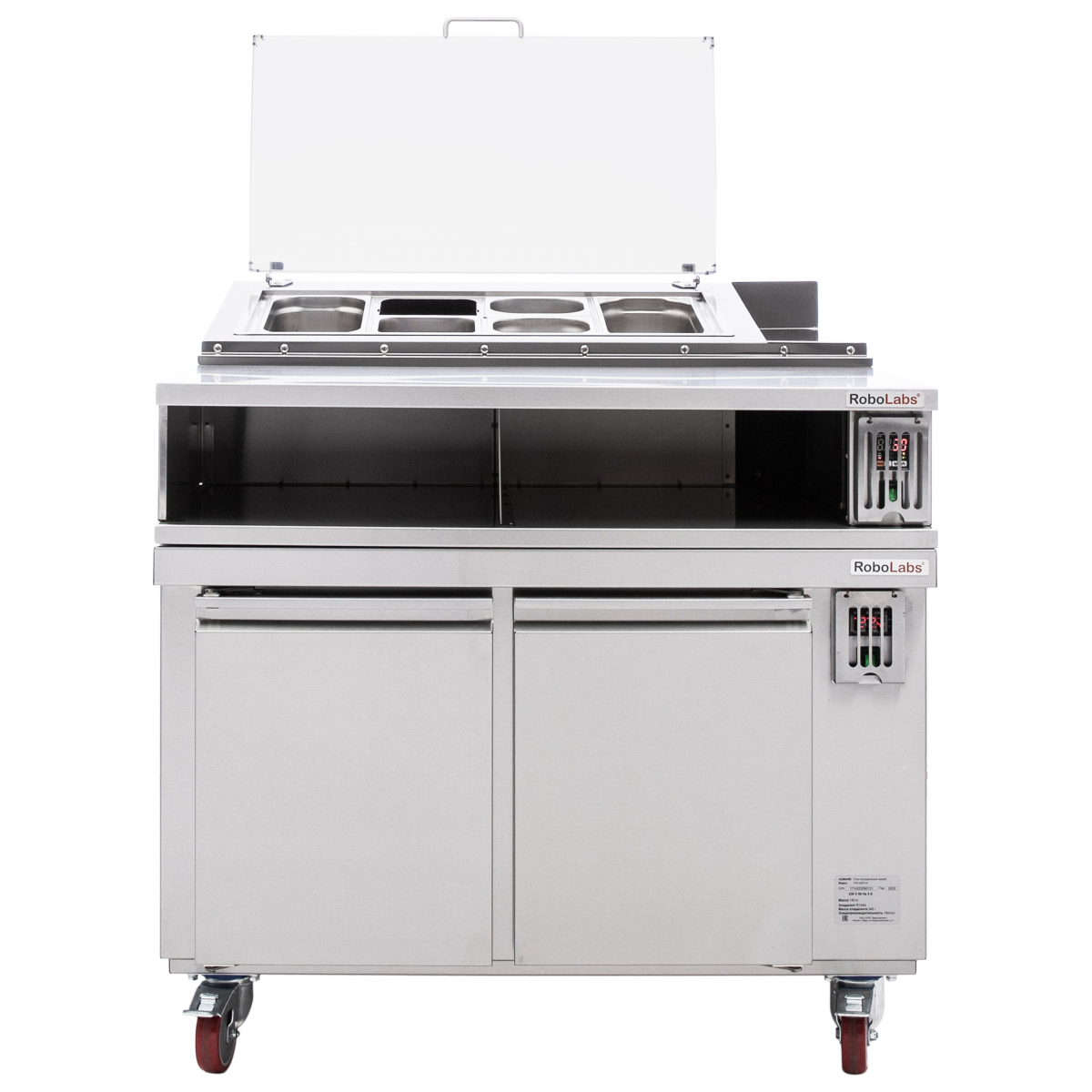 Мармит RoboLabs МПК-4КП-31 на 4GN1/3 с рабочей поверхностью. Возможность собрать мармит с расположением зоны под POS слева. Спереди нейтральная рабочая поверхность. Под рабочей поверхностью зона упаковки, 2 ниши по 420х450х150 мм.