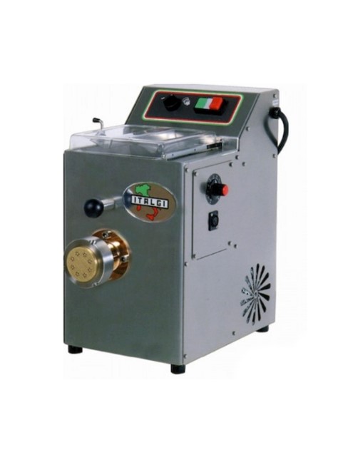 Машина для формования Italgi Micra предназначена для изготовления пасты в небольших заведениях общепита (кафе, столовых, ресторанах), гастрономах и пекарнях. Данное оборудование имеет загрузку теста до 1.5 кг, производительность 6 кг в час, электромеханическую панель управления, диаметр насадки 70 мм. Модель укомплектована ножом для короткой пасты с электронным регулированием скорости.