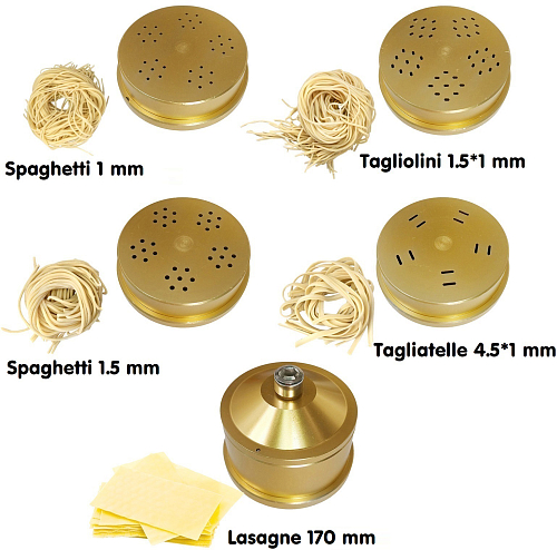 • 5 фильер из алюминия с бронзовым покрытием для приготовления Spaghetti шириной 1 и 1,5 мм, Tagliolini 1,5*1 мм, Tagliatelle 4,5*1 мм, листа теста Lasagne шириной до 170 мм