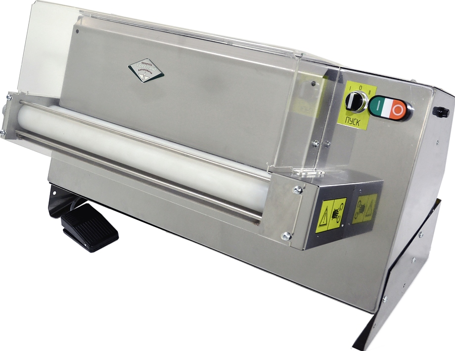 Машина тескораскаточная Торгмаш, Барановичи ТРМ-500 предназначена для раскатки заготовок из теста в пласт при приготовлении пиццы, хлеба, коржей, пельменей, лапши и других мучных изделий на предприятиях торговли и общественного питания. Модель оснащена асинхронным двигателем, червячным редуктором, трансмиссией с коническим редуктором и 2 установленными на осях валиками. Корпус выполнен из высококачественной нержавеющей стали, валики – из специального материала, исключающего прилипание.