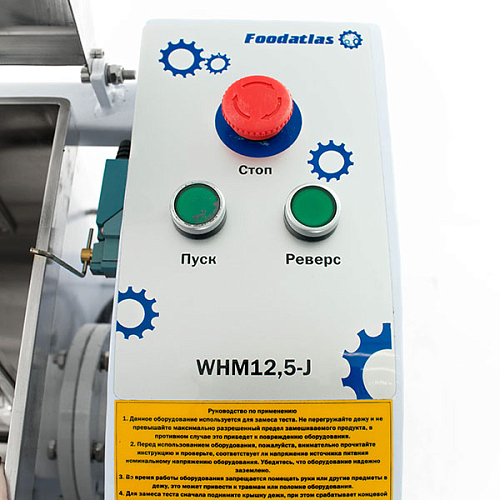 Машина тестомесильная Foodatlas WHM(J)-12,5 (380V) используется на предприятиях общественного питания и торговли для замеса крутого теста для пельменей, лаваша, мантов, чебуреков и других хлебо-булочных изделий, а также перемешивания ингридиентов соусов и начинок. Модель оснащена поворотной дежой с крышкой и ручкой, горизонтальным месильным органом J-образной формы с 4 лопастями, наклонным лотком для выгрузки и электромеханической панелью управления. Корпус выполнен из окрашенного металла с термовыводящими отверстиями, месильный орган, дежа и лоток – из нержавеющей стали, смотровое окно – из оргстекла, упаковка – фанерный ящик.