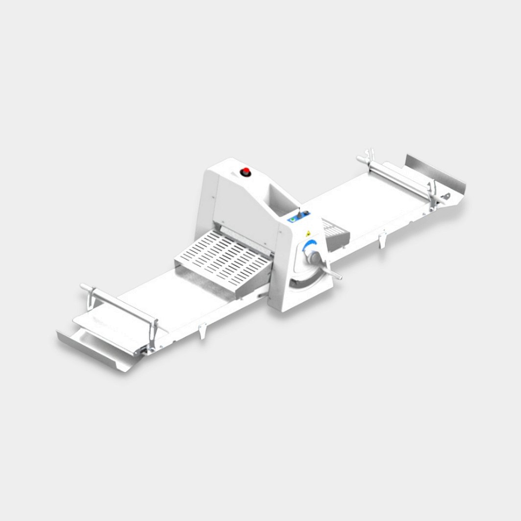 Модель оснащена ванночкой для муки, 2 раскаточными скалками, 2 ленточными конвейерными транспортерами, 2 установленными на кронштейны валками системы намотки теста, 2 поддонами, устойчивыми опорами и панелью управления. Корпус выполнен из стали с антикоррозийным покрытием, валки и другие контактирующие с продуктом детали – из полированной нержавеющей стали.