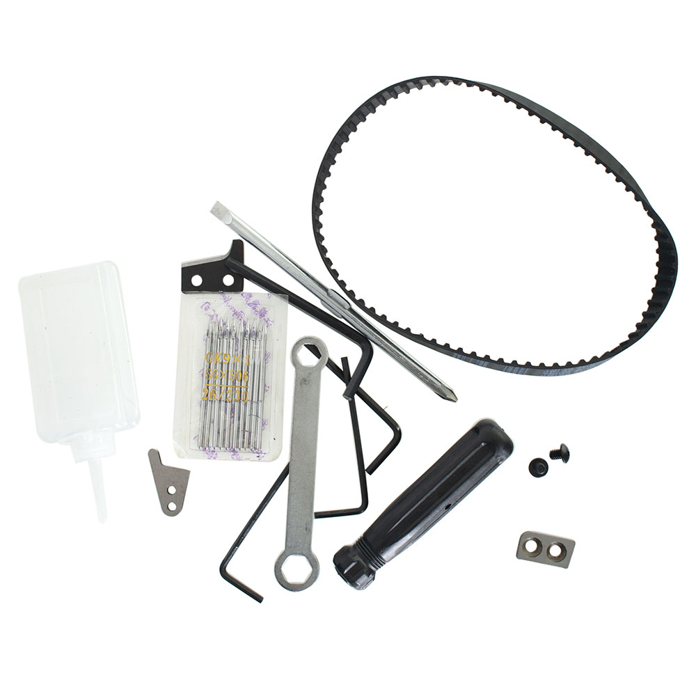 В комплект поставки входят выносной аккумулятор и расширенный комплект запасных частей (набор сменных игл, ремни привода, маслёнка, ключи-шестигранники)