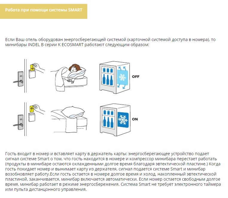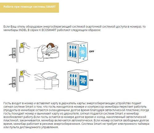 С помощью пульта управления можно запрограммировать временные промежутки работы минибара. Обычно минибар программируют на работу в течении 3-х часов утром (например с 9 до 11 часов) и 3-х часов вечером (например с 18 до 20 часов). Этого времени достаточно для охлаждения продуктов и сохранения их прохладными (за счёт встроенного аккумулятора холода).