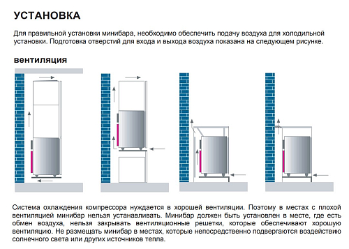 Оборудование компрессорного типа охлаждения славится своей практически бесшумной работой, низким потреблением электроэнергии, так же относятся самому высокому классу энергоэффективности. В контуре используется экологически безопасный хладагент R600a. Глухая перенавешиваемая дверца. Полки изготовлены из пластика. В комплекте имеется специальный крепеж к двери для возможности встроить оборудование в мебель. Сенсор открывания двери.