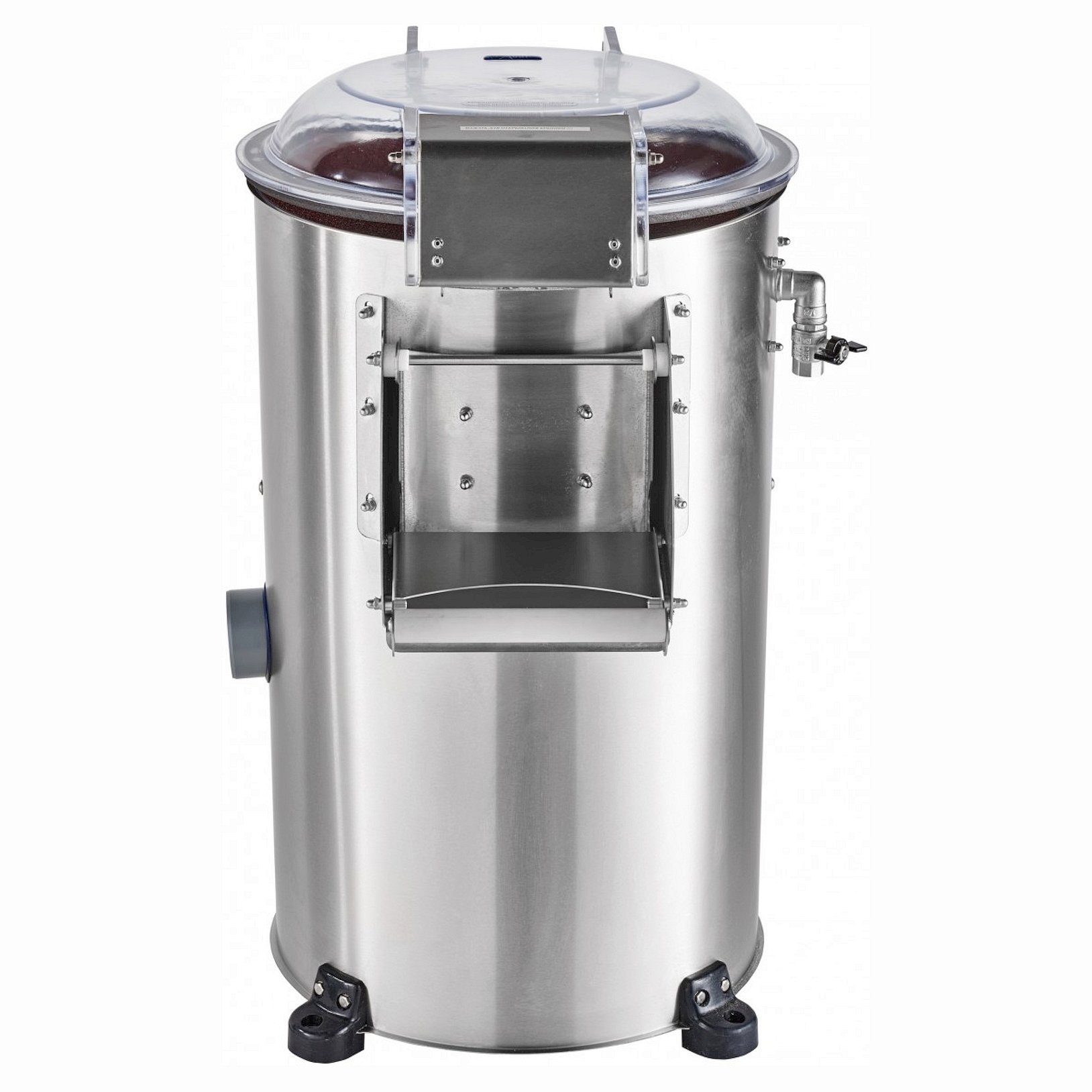 Корпус изделий выполнен из высококачественной нержавеющей стали. Процесс очистки состоит в механическом воздействии на продукт рабочих органов (абразивного диска и внутренней камеры которая также состоит из абразивного материала) и воды. Мезга удаляется через отверстие на дне станины по сливному шлангу в канализацию напрямую или через фильтр-отстойник. Включение машины производится путем поворота таймера. Затем включается вода. Через крышку загружается продукт. Степень очистки определяется визуально.