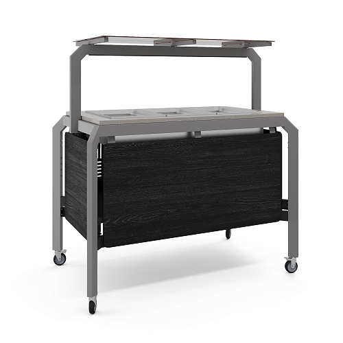 Модуль мобильный горячий КОБОР AT120 aluminum/glazed/sky предназначен для демонстрации, кратковременного хранения и поддержания в горячем состоянии гарниров в гастроемкостях в составе линий раздачи в кафе, ресторанах и фудкортах, на предприятиях общественного питания и торговли. Модель оснащена механическим терморегулятором, ножками на поворотных колесах для мобильности, 2 колеса оснащены тормозом. Каркас выполнен из профиля сечением 60х30, покрытого порошковой краской, внешний корпус - из ЛДСП, столешница - из искусственного камня.