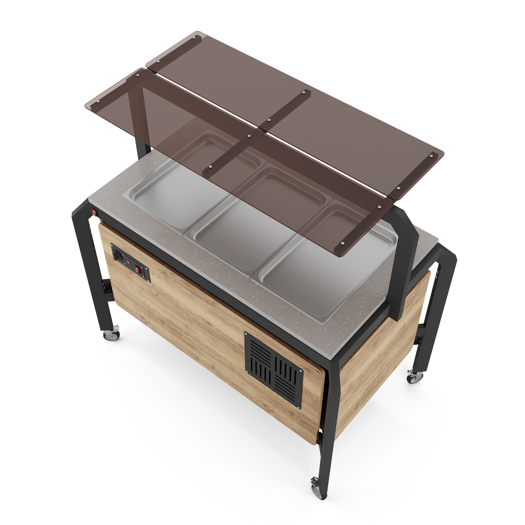 Модуль мобильный горячий КОБОР AT120 black/olovo/diamant предназначен для демонстрации, кратковременного хранения и поддержания в горячем состоянии гарниров в гастроемкостях в составе линий раздачи в кафе, ресторанах и фудкортах, на предприятиях общественного питания и торговли. Модель оснащена механическим терморегулятором, ножками на поворотных колесах для мобильности, 2 колеса оснащены тормозом. Каркас выполнен из профиля сечением 60х30, покрытого порошковой краской, внешний корпус и столешница - из ЛДСП.