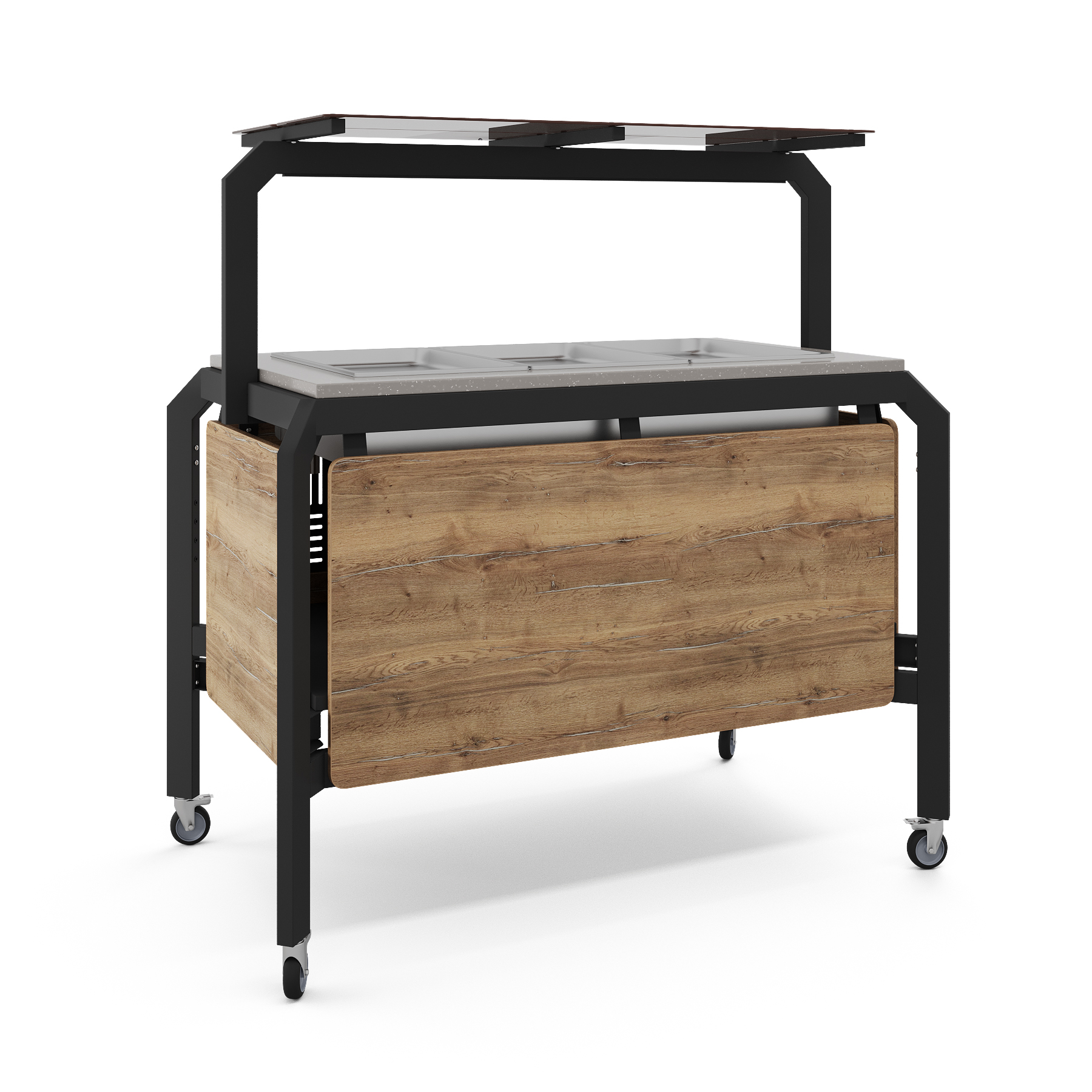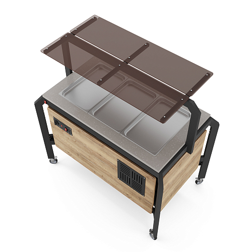 Модуль мобильный горячий КОБОР AT120 black/olovo/sky предназначен для демонстрации, кратковременного хранения и поддержания в горячем состоянии гарниров в гастроемкостях в составе линий раздачи в кафе, ресторанах и фудкортах, на предприятиях общественного питания и торговли. Модель оснащена механическим терморегулятором, ножками на поворотных колесах для мобильности, 2 колеса оснащены тормозом. Каркас выполнен из профиля сечением 60х30, покрытого порошковой краской, внешний корпус - из ЛДСП, столешница - из искусственного камня.