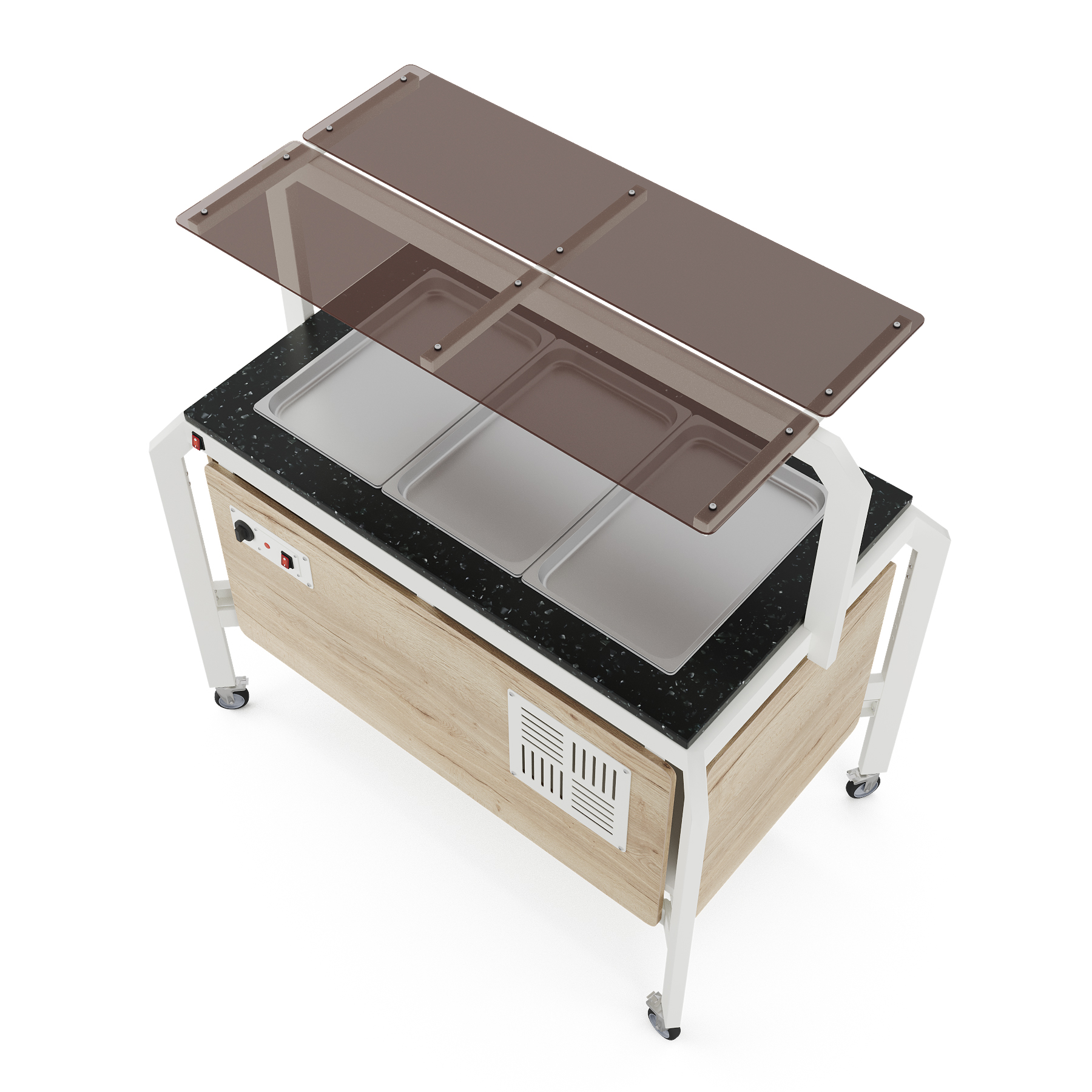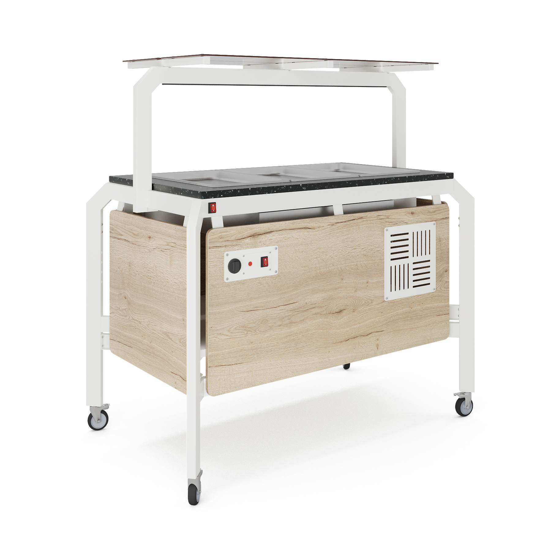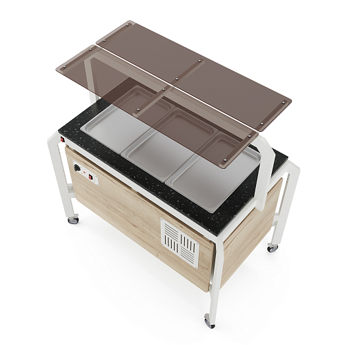 Модуль мобильный горячий КОБОР AT120 white/natural/black предназначен для демонстрации, кратковременного хранения и поддержания в горячем состоянии гарниров в гастроемкостях в составе линий раздачи в кафе, ресторанах и фудкортах, на предприятиях общественного питания и торговли. Модель оснащена механическим терморегулятором, ножками на поворотных колесах для мобильности, 2 колеса оснащены тормозом. Каркас выполнен из профиля сечением 60х30, покрытого порошковой краской, внешний корпус и столешница - из ЛДСП.