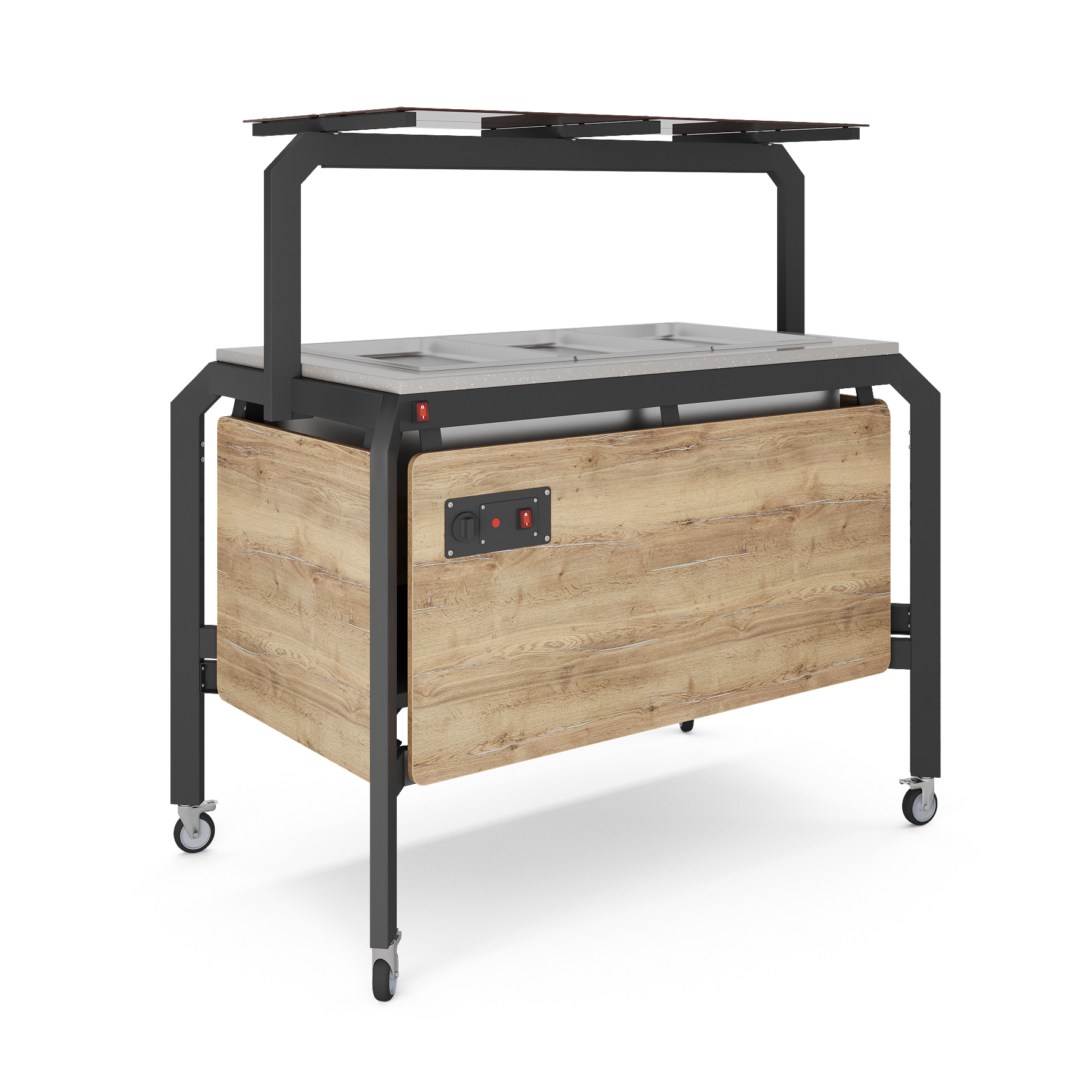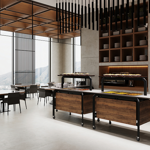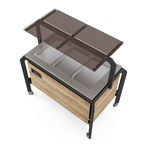 Модуль мобильный холодильный КОБОР AO120 black/olovo/diamant предназначен для демонстрации, кратковременного хранения охлаждения и раздачи салатов и холодных закусок из мяса, рыбы, фруктов и овощей в составе линий раздачи в кафе, ресторанах и фудкортах, на предприятиях общественного питания и торговли. Модель оснащена механическим терморегулятором, ножками на поворотных колесах для мобильности, 2 колеса оснащены тормозом. Каркас выполнен из профиля сечением 60х30, покрытого порошковой краской, внешний корпус - и столешница - из ЛДСП.