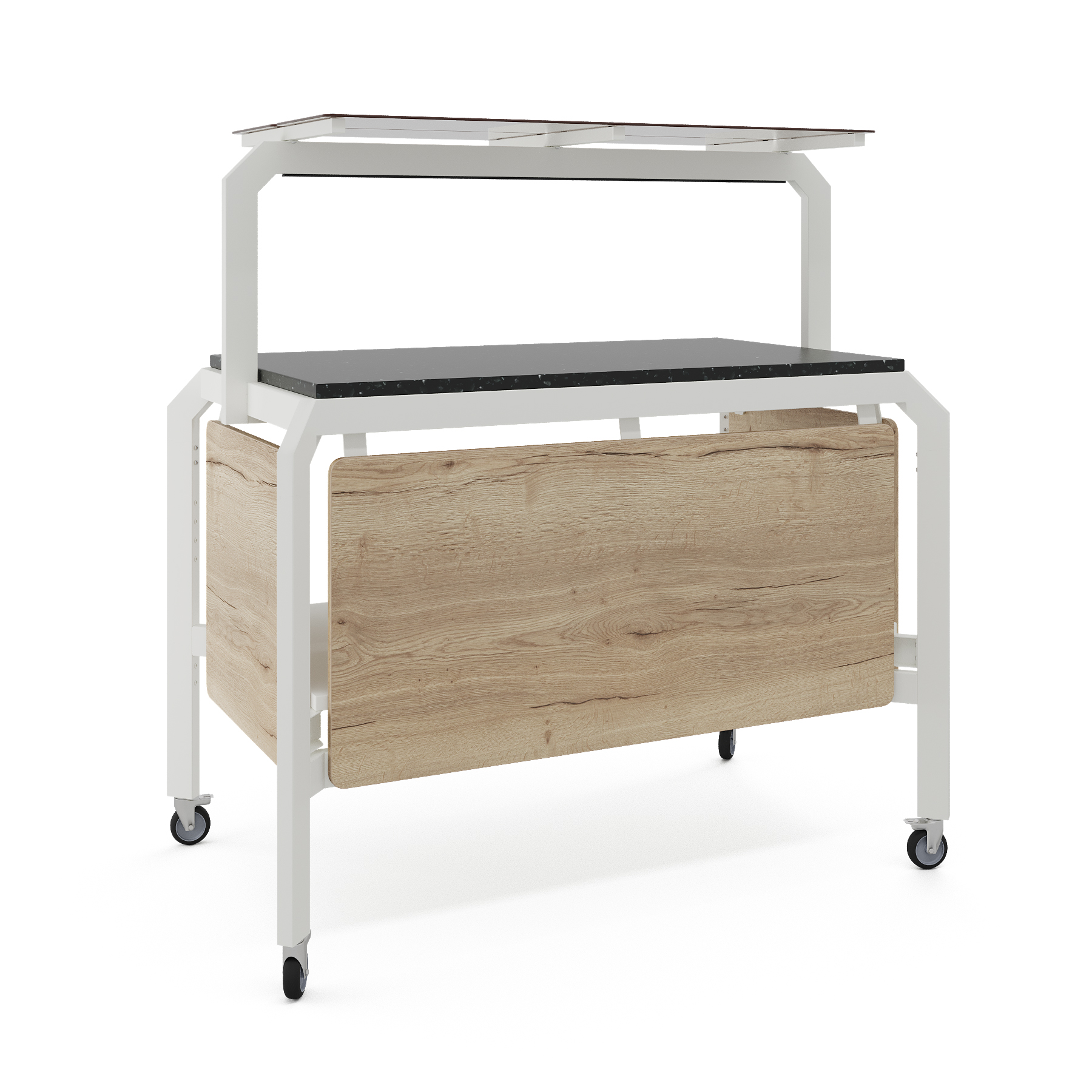 Модуль мобильный нейтральный КОБОР AN120 white/natural/black предназначен для демонстрации, кратковременного хранения и раздачи готовых блюд: салатов, закусок, кондитерских изделий и напитков, и чистых тарелок в составе линий раздачи или самообслуживания в кафе, ресторанах и фудкортах, на предприятиях общественного питания и торговли. Модель оснащена полкой-надстройкой со стеклом и поворотными колесами для мобильности, 2 колеса оснащены тормозом. Сварной каркас выполнен из профиля сечением 60х30, покрытого порошковой краской, внешний корпус и столешница - из ЛДСП.